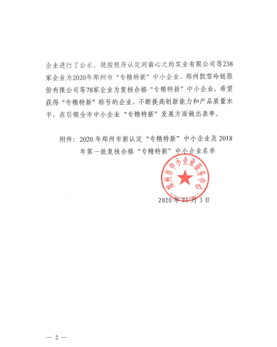 2020年經(jīng)鄭州市“專精特新”中小企業(yè)專家評審會認定,宇明閥門集團有限公司符合“專精特新”中小企業(yè)的標準,認定宇明閥門集團有限公司為“專精特新”的稱號。