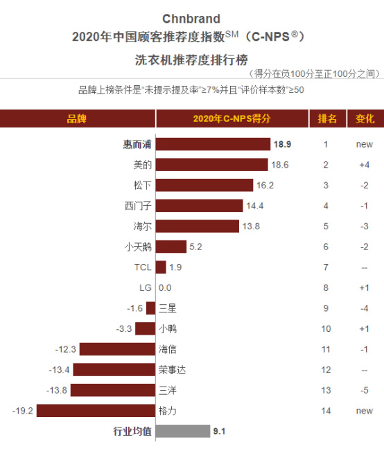 全面品牌價(jià)值管理和品牌評級權(quán)威機(jī)構(gòu)中企品研(Chnbrand)發(fā)布的“2020中國顧客推薦度指數(shù)”(China Net Promoter Score,簡稱C-NPS)中,惠而浦品牌以18.9的高分榮登“洗衣機(jī)推薦度排行榜”第一名,是中國消費(fèi)者最為推薦的家電品牌之一。 中企品研C-NPS顧客推薦度指數(shù)反映有消費(fèi)體驗(yàn)的消費(fèi)者愿意向他人推薦企業(yè)產(chǎn)品或服務(wù)的程度,是測定品牌口碑、衡量顧客忠誠度的關(guān)鍵指標(biāo)?;荻制放颇軌驑s膺2020年洗衣機(jī)品類推薦度指數(shù)榜單首位,證明其所堅(jiān)持的“健康家”品牌理念、為人們打造健康和美好家居生活的努力,得到了市場的廣泛認(rèn)可。