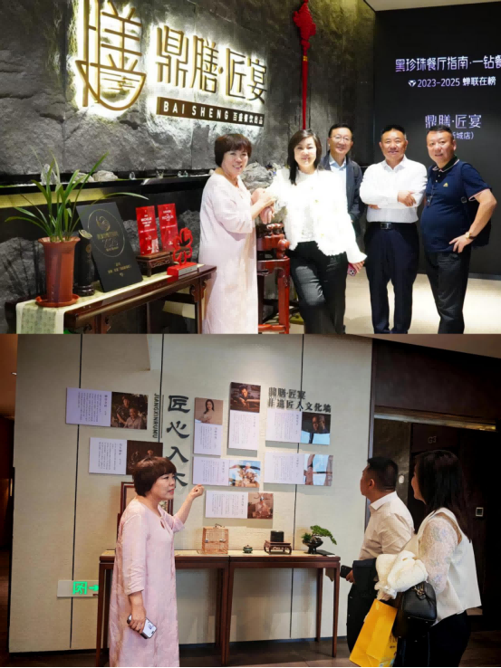 隨后,代表團(tuán)前往蘇浙菜知名餐廳鼎膳匠宴(高鐵新城店),重點(diǎn)參觀了企業(yè)的“非遺匠人文化墻”。作為黑珍珠餐廳指南一鉆餐廳,鼎膳匠宴將非遺技藝與餐飲制作深度結(jié)合,文化墻上展示的匠人故事與技藝傳承歷程,讓代表團(tuán)直觀感受到“匠心入木”的餐飲精神。