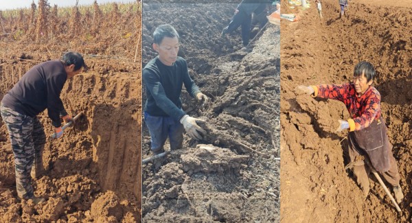 在采挖現(xiàn)場(chǎng)可以看到,即便30多年挖掘山藥的老手,也需要用手指輕輕撥開(kāi)枯黃的藤蔓,像對(duì)待初生的嬰孩般拂去周邊浮土。他們每一鐵鍬斜插進(jìn)土縫的瞬間,都屏住了呼吸,輕輕地將黃褐色山藥周邊的泥土撥去,當(dāng)泥塊簌簌墜落時(shí),一根根像生了銹的鐵棒般的山藥完全顯露,然后雙手迅速用掌心接住,仿佛那一米多長(zhǎng)的山藥是易碎的瓷器,連呼吸都放輕了,生怕驚醒沉睡在泥土深處的珍寶。采挖工人將山藥挖出后,不能立即清理打包裝箱。由于當(dāng)?shù)赜糜诜N植山藥的壚土被當(dāng)?shù)匕傩辗Q之為“軟時(shí)如棉、硬時(shí)如鐵”,因此還要轉(zhuǎn)運(yùn)到通風(fēng)處進(jìn)行短暫晾曬,當(dāng)包裹山藥的泥土晾曬至半干半濕時(shí)才能去除,一根根帶有“銹斑”的山藥才露出其真正的模樣。
