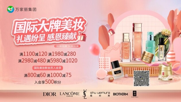 年末狂歡再加磅,冬季開(kāi)啟奢寵模式。國(guó)際美妝會(huì)員日11月24日至11月30日。大牌美妝DIOR、LANCOME、YSL、植村秀、BOTHERM、羽西,滿1100減120,滿1980減280,滿2980減480,滿5980減1020。入會(huì)萬(wàn)家麗國(guó)際MALL美妝新會(huì)員享,滿800減60滿1000減75,入會(huì)即得500積分。會(huì)員生日當(dāng)天雙倍積分,當(dāng)月優(yōu)享生日禮包券,會(huì)員日多倍積分(積分可兌換電子券,5000積分兌換100元代金券)。 更有滿額禮贈(zèng)、會(huì)員回柜有禮、套盒優(yōu)惠等你來(lái)享!還享積分全國(guó)通用、價(jià)格低于免稅店、優(yōu)惠秒殺全城!年度最佳囤貨時(shí)機(jī),關(guān)注“湖南萬(wàn)家麗實(shí)業(yè)集團(tuán)”官方微信公眾號(hào)了解更多美妝動(dòng)態(tài),解鎖更多驚喜福利。