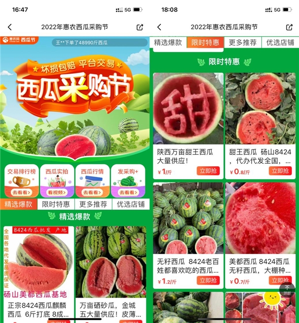 (惠農(nóng)網(wǎng)西瓜采購(gòu)節(jié)正式啟動(dòng)) 據(jù)惠農(nóng)網(wǎng)大數(shù)據(jù)統(tǒng)計(jì),自4月以來,西瓜熱度一路走飆升,搜索熱度環(huán)比增幅達(dá)32%,其中以甜王西瓜、8424西瓜、美都西瓜最受市場(chǎng)歡迎。截止5月第1周,西瓜價(jià)格再創(chuàng)新高,每斤均價(jià)達(dá)到1.1元,環(huán)比增長(zhǎng)2%。惠農(nóng)網(wǎng)產(chǎn)地經(jīng)紀(jì)人也發(fā)布了對(duì)后市行情分析,預(yù)測(cè)西瓜價(jià)格還將維持在高位。 為了給產(chǎn)銷雙方搭建交易新渠道,惠農(nóng)網(wǎng)西瓜采購(gòu)節(jié)驚喜上線?;顒?dòng)持續(xù)至5月31日,為期22天,會(huì)場(chǎng)開設(shè)了“交易排行榜”“視頻看貨”“發(fā)采購(gòu)”“西瓜行情”4個(gè)直達(dá)入口,方便買家迅速掌握全國(guó)西瓜一手行情,千里之外直連產(chǎn)地線上看貨,便捷發(fā)布采購(gòu)需求鎖定最佳貨源。 同時(shí),惠農(nóng)網(wǎng)精選歷史交易量高、好評(píng)率高的優(yōu)質(zhì)商家,全平臺(tái)采購(gòu)價(jià)低至7折;所有活動(dòng)商家均來自西瓜核心產(chǎn)區(qū),承諾所有西瓜壞損包賠,為采購(gòu)商、消費(fèi)者提供品種齊全、品質(zhì)優(yōu)秀、價(jià)格實(shí)惠的產(chǎn)品。 活動(dòng)一經(jīng)啟動(dòng),惠農(nóng)網(wǎng)商家紛紛化身家鄉(xiāng)西瓜的“代言人”,通過設(shè)置商家優(yōu)惠、拍攝抖貨視頻、上傳西瓜行情等方法推廣賣貨,吸引了眾多采購(gòu)商們下單。