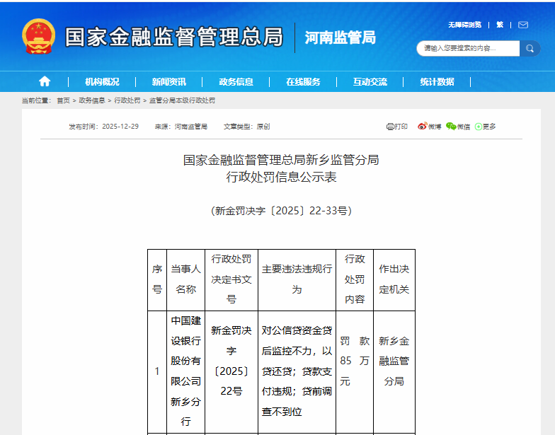 2025 年 12 月 29 日,國家金融監(jiān)督管理總局新鄉(xiāng)監(jiān)管分局發(fā)布行政處罰信息公示表,中國建設(shè)銀行股份有限公司新鄉(xiāng)分行因多項(xiàng)信貸業(yè)務(wù)違規(guī)被罰 85 萬元,四名相關(guān)責(zé)任人同步受到警告處罰。