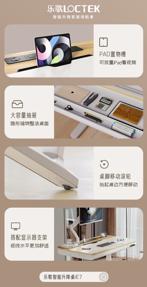 科技創(chuàng)新讓產(chǎn)品更有品質(zhì)。樂歌智能升降桌iE7系列采用樂歌自主研發(fā)的雙電機,強勁驅(qū)動,讓書桌升降速度更快的同時還能實現(xiàn)高穩(wěn)定性和超靜音效果。自帶的無線充電功能滿足手機即放即充,還配置有電源管理系統(tǒng),整桌僅需一根電源線,內(nèi)嵌式排插滿足護眼燈、學(xué)習(xí)機、打 印機等電子學(xué)習(xí)用品的用電需求。超大承重量可以滿足不同人群的多重需求,站著打字桌面也不會晃動,用科技打造高品質(zhì)的辦公、學(xué)習(xí)環(huán)境。