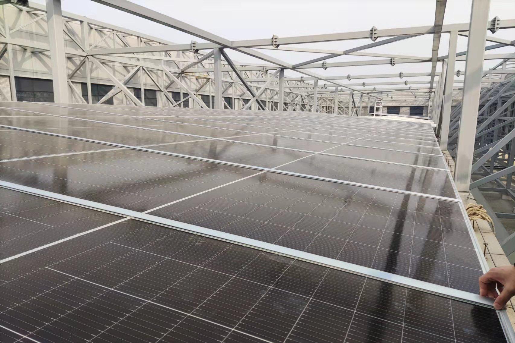 水發(fā)大廈BIPV分布式光伏發(fā)電項目位于水發(fā)大廈樓頂,裝機容量為74.1KWP。該項目采用114塊650WP高功率雙核雙玻PERC電池組件替代傳統(tǒng)屋面,主體結(jié)構(gòu)采用鋼框架支撐鋁合金導水槽,在提升整體安全可靠性的同時,光伏屋面與建筑完美結(jié)合。該系統(tǒng)采用“自發(fā)自用,余電上網(wǎng)”的計量模式,首年發(fā)電量9.03萬度,生命周期25年總發(fā)電量為206.57萬度;年平均節(jié)約標準煤25.32噸,減少SO2排放量15.45噸,減少CO2排放量69.24噸,緩解環(huán)境污染,實現(xiàn)了節(jié)能減排,為“碳達峰、碳中和”目標奠定了良好基礎。
