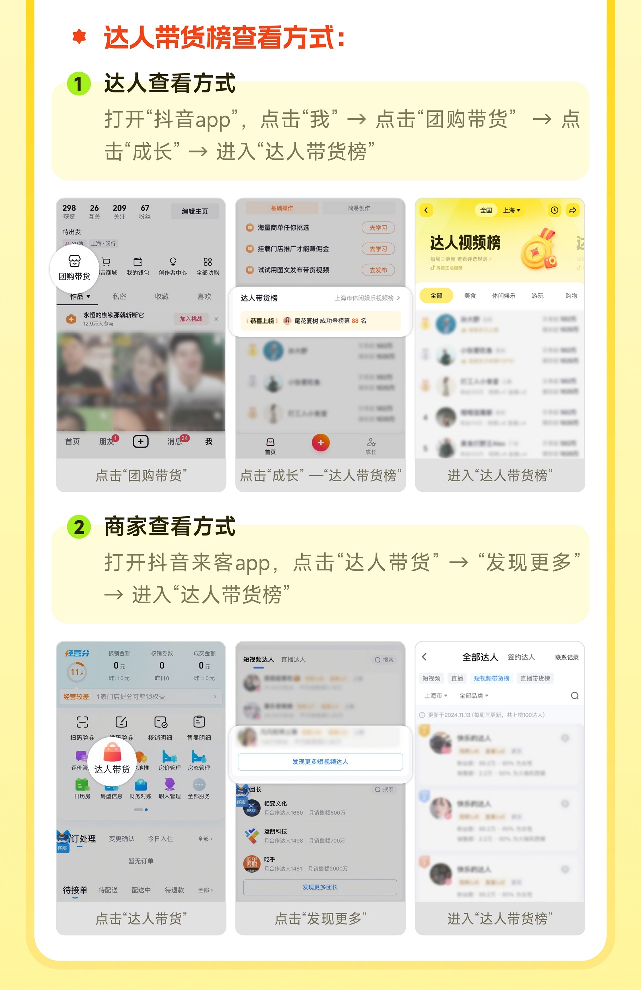 達人上“團購達人中心”即可查看。商家上“抖音來客”進入“達人帶貨”頁面即可找到榜單入口。