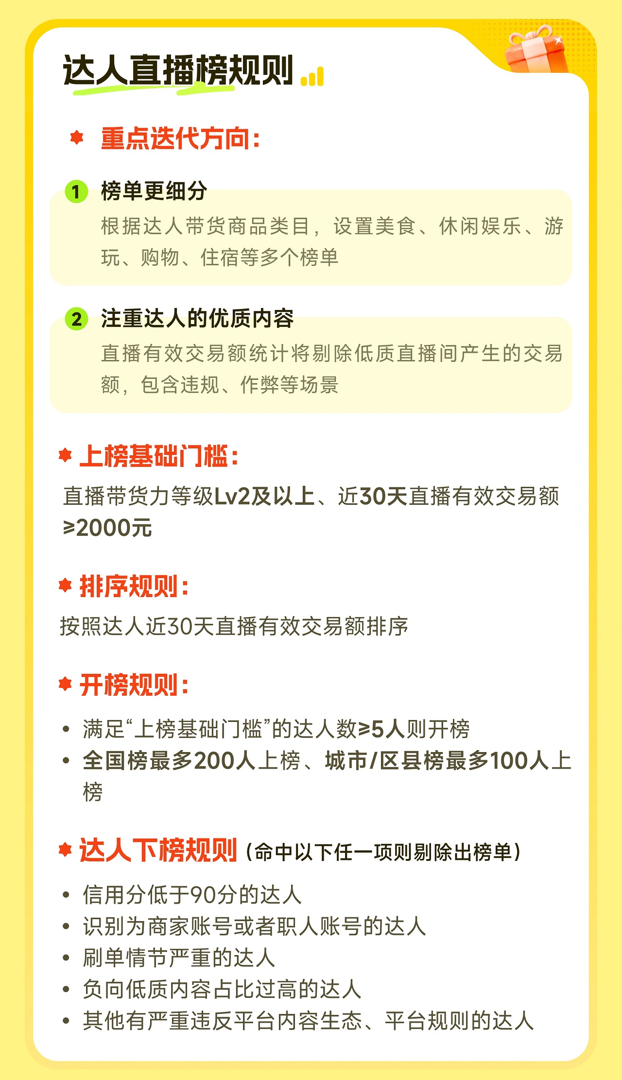 ·更凸顯達人綜合實力為提高榜單的認可度,打造榜單的公信力,相較于舊榜僅結(jié)合有效交易額排序, 新榜單將綜合參考有效交易額、有效播放量來排序,更能凸顯達人的綜合實力。這一變化,將為專注內(nèi)容的達人創(chuàng)造更多機會,為有內(nèi)容訴求的商家提供可靠的選人參考。·更多細分榜單,商家選擇更精準為了給各區(qū)域不同賽道達人提供榮譽激勵,幫助商家通過細分榜單更易找到適合自己的達人,更新之后的「達人視頻榜」設(shè)置了更多的細分榜單。 舊版的榜單,僅支持“上海美食榜”“北京酒旅榜”這類“城市x行業(yè)榜”的呈現(xiàn)方式;更新后的榜單, 其展示形式細化到“區(qū)縣x細分類目榜”的展示形式,其中美食賽道,還會細拆二級類目。如:“上海徐匯區(qū)火鍋榜”“北京海淀區(qū)游玩榜”“上海普陀區(qū)燒烤榜”,更能體現(xiàn)達人在細分領(lǐng)域的經(jīng)營情況。 ·城市/區(qū)縣榜,更關(guān)注達人帶本地商戶的效果在舊版榜單中,城市榜單會統(tǒng)計達人帶所有商戶的數(shù)據(jù),這就使得很多本地商家,有時較難在榜單中找到能帶本地商戶的達人。 為了幫助區(qū)域/城市商家提升選達人效率,也讓專注于帶本地商戶的達人有更多機會被看到,新榜單區(qū)分成兩種類型,全國榜和城市/區(qū)縣榜: 其中全國榜統(tǒng)計達人帶所有商戶的數(shù)據(jù);而升級后的城市/區(qū)縣榜,僅會統(tǒng)計達人帶該城市/區(qū)縣本地商戶的數(shù)據(jù),大大提升了本地商戶在選擇達人時的精準度。·更貼合達人實際經(jīng)營地在過往,受限于達人常駐城市,達人上榜情況與達人重點經(jīng)營城市不完全匹配。譬如,一個常駐北京的達人帶三亞的商戶,會被統(tǒng)計到北京排行榜,三亞本地的商家可能在本地榜單中無法找到這位優(yōu)質(zhì)達人。 升級后, 榜單的數(shù)據(jù)統(tǒng)計將不受達人常駐地影響,會 結(jié)合達人視頻掛載的門店所屬的城市和區(qū)縣來統(tǒng)計, 允許達人上多個榜。這不僅為商家的經(jīng)營帶來更好的選人參考,跨區(qū)域經(jīng)營的達人也有機會獲得更多商單。 ·注重達人的優(yōu)質(zhì)內(nèi)容升級后的榜單中, 負向視頻內(nèi)容數(shù)據(jù)將不計入到榜單的數(shù)據(jù)統(tǒng)計里, 如虛假素材、搬運等,榜單更注重達人內(nèi)容的優(yōu)質(zhì)性。