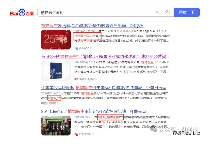 清揚(yáng)君百度搜索發(fā)現(xiàn),目前網(wǎng)上還有大量關(guān)于“植物醫(yī)生國禮”的宣傳。如2019年6月,齊魯壹點(diǎn)宣傳:早在2015年,植物醫(yī)生就成為“一帶一路”萬里行唯一指定化妝品,并在米蘭世博會期間亮相中國館,產(chǎn)品作為國禮被贈送給多國政要。近日,民族品牌DR PLANT植物醫(yī)生明星單品“蘭精靈”遠(yuǎn)赴泰國曼谷,作為國禮被贈予泰國拉瑪四世的第五代王室成員帕翁昭女士。