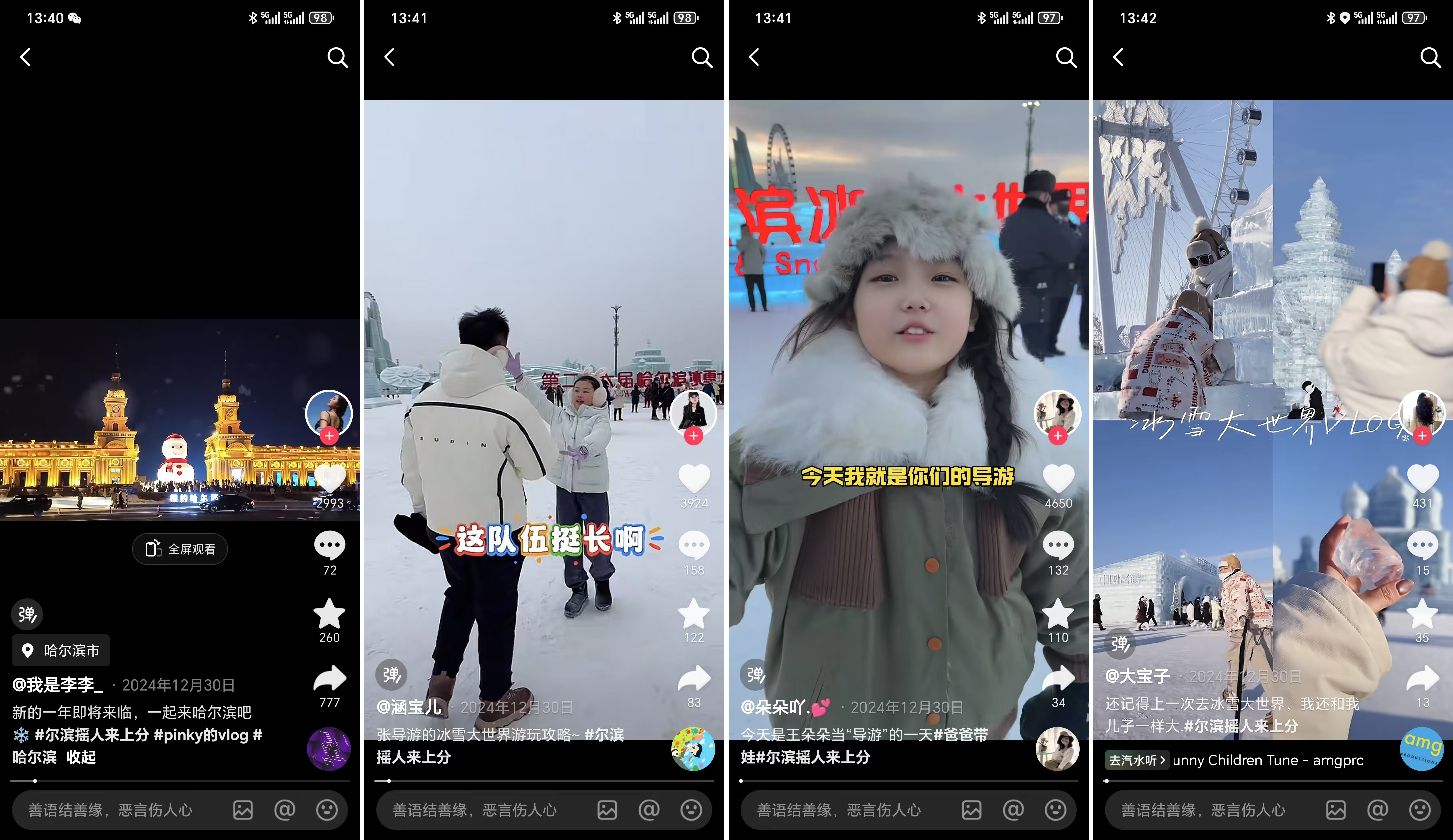 達(dá)人們以“哈爾濱文旅導(dǎo)游”的視角,沉浸式講解冰雪場(chǎng)景與親子旅游項(xiàng)目,將飛鶴的品牌信息自然融入用戶的春節(jié)記憶中。