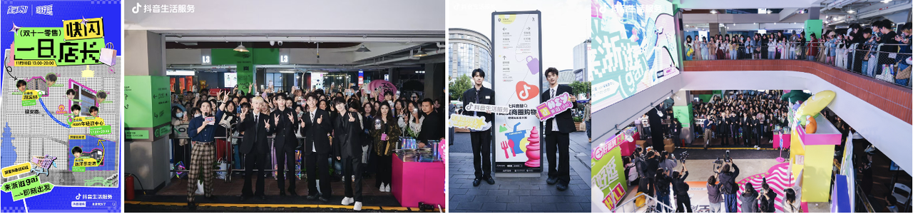 以“逛gai”為發(fā)力點,抖音生活服務(wù)打造“來浙逛gai”消費新場景。四位超人氣「一日店長」進駐杭州遠(yuǎn)洋樂堤港、湖濱88、ICON年輕派中心三大潮流商圈,以“線下新奇體驗+線上福利轟炸”吸引來往行人駐足打卡,引爆線上和線下熱度。