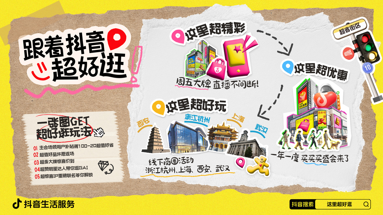 你有多久沒有逛街了? 在周五下班的路上 落日還在車窗上搖晃 晚風(fēng)微涼 與好友相約老地方 華燈初上,櫥窗明亮 人潮南來北往 或是在抖音團購開逛 隨心徜徉 喚醒沉睡味蕾 切換慵懶周末 從金秋到隆冬,越來越多的市民游客跟著抖音生活服務(wù)“超好逛”,共赴一場城市游玩狂歡。兩個月超chill的逛街之旅,給忙碌的疲憊身心“放個假”。這就是抖音生活服務(wù)推出的區(qū)域商圈IP營銷活動——「抖音超好逛」,在線上線下打造出獨具特色的超好逛“微度假”模式?;顒踊ㄊ铰?lián)動政府、明星、IP等種草抖音超好逛的生活方式,掀起“跟著抖音超好逛”的用戶消費新潮流。