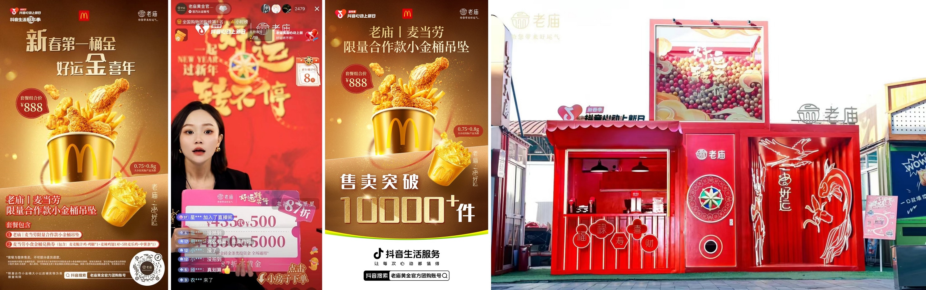 12月21日至1月5日,老廟黃金聯(lián)動「抖音心動上新日」啟動“好運轉(zhuǎn)不停,一起過新年”主題活動,發(fā)布了全新好運2.0系列爆款產(chǎn)品,并與麥當(dāng)勞跨界合作推出限量版“小金桶吊墜”。通過雙品牌直播連麥、上海豫園快閃、#新年第一桶金 熱點話題 等多元創(chuàng)意玩法,老廟黃金從實物產(chǎn)品與情感共鳴雙維度透傳品牌好運文化理念,為消費者送上了新年祝福的同時,在關(guān)鍵節(jié)點實現(xiàn)品效雙收。