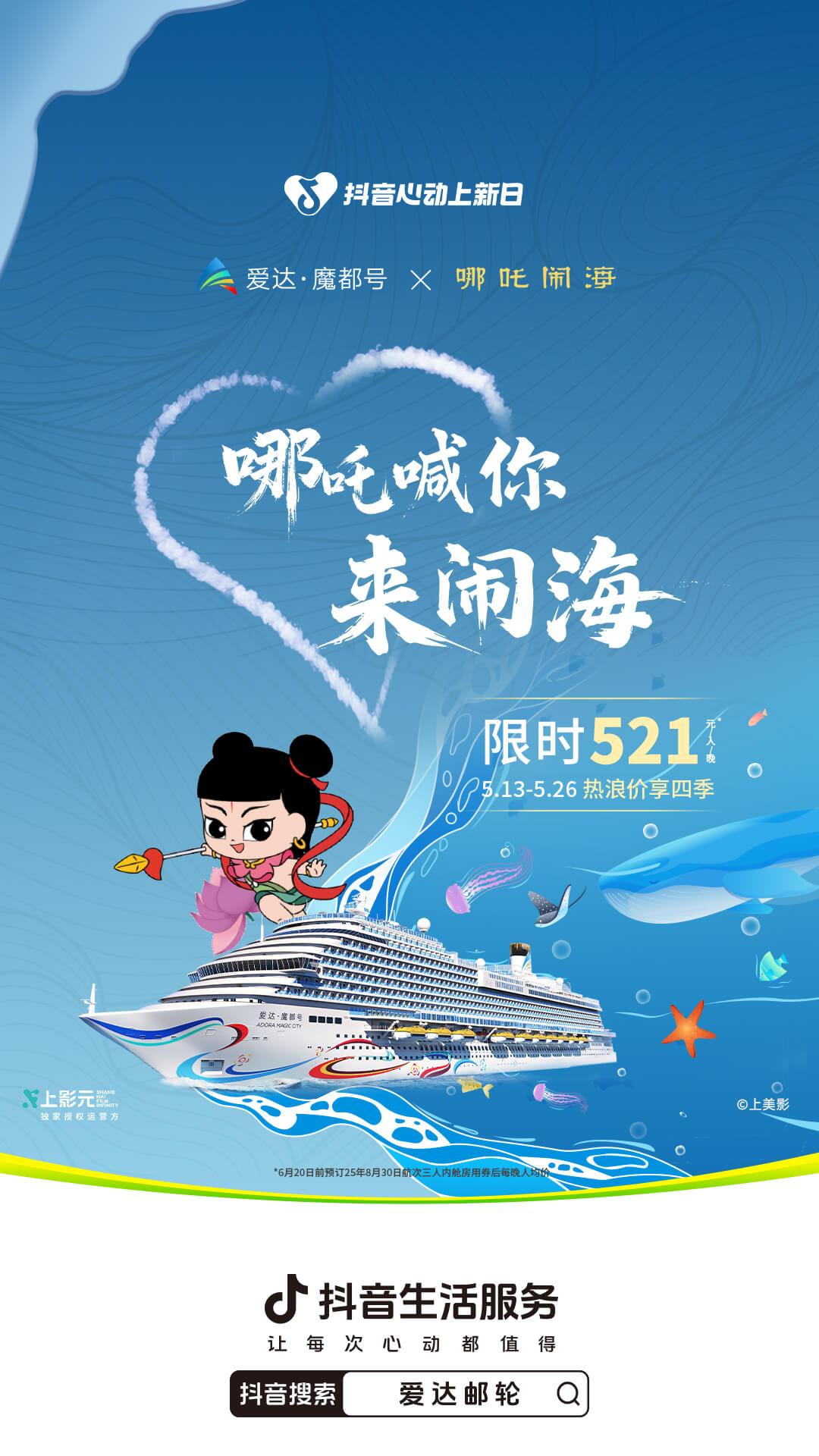 在暑期出游旺季即將到來之際,愛達(dá)郵輪與經(jīng)典動(dòng)畫“哪吒鬧海”聯(lián)名,借助「抖音心動(dòng)上新日」的力量,為廣大用戶打造了一場海上奇趣之旅。通過推出抖音心動(dòng)上新日獨(dú)家優(yōu)惠通兌券包,創(chuàng)新采用雙城雙船實(shí)景直播模式,將國民對哪吒的童年記憶與對海洋的向往,轉(zhuǎn)化為可體驗(yàn)的沉浸郵輪行程。借助愛達(dá)郵輪與哪吒鬧海“國民文化符號(hào)”的深度綁定,以“郵輪+國潮”跨界重塑度假場景,既滿足了用戶對文化認(rèn)同與親子歡聚的需求,又精準(zhǔn)撬動(dòng)了年中旅游消費(fèi)市場。
