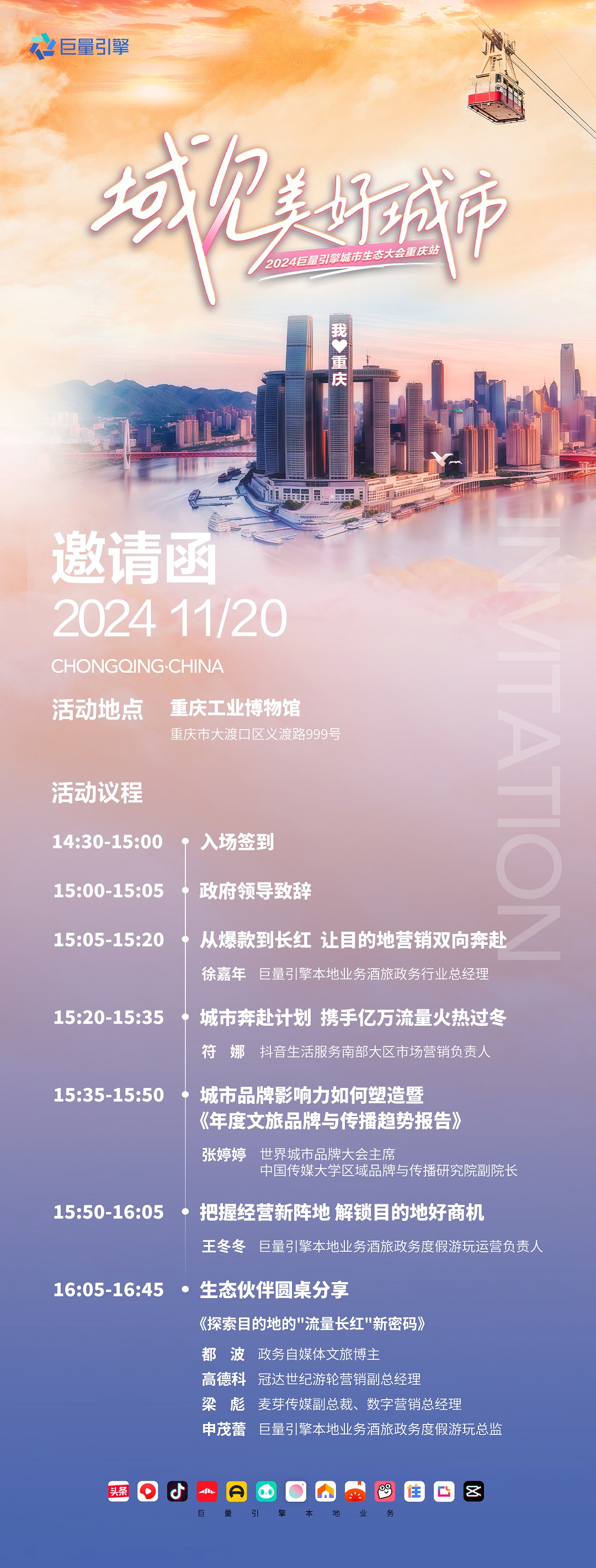 不管是8D奇幻的山城景觀,還是極具煙火氣的巴渝文化,這座城市天然擁有許多潛在消費(fèi)增長(zhǎng)點(diǎn),商家也借助平臺(tái)力量,已然打造出了許多成功案例。 在國(guó)慶出游剛結(jié)束的兩周內(nèi),世紀(jì)游輪打造首個(gè)三峽游輪一日游產(chǎn)品“江山如詩(shī)號(hào)”游輪,實(shí)現(xiàn)了千里江陵一日還的昔日盛景,于抖音實(shí)現(xiàn)3億+曝光,品牌也成功躍遷為巨量算數(shù)酒旅品牌榜單TOP10。不僅如此,品牌還攜手平臺(tái)品星推搜多維度產(chǎn)品資源,強(qiáng)勢(shì)曝光&種草人群,打造#游輪上的東方美學(xué)、#這就是古人游的三峽嗎 2個(gè)區(qū)域熱點(diǎn)事件,并利用搜索品專承接大量曝光看后搜流量,結(jié)合直播間常態(tài)化開(kāi)播并投廣,實(shí)現(xiàn)用戶高效種草+轉(zhuǎn)化鏈路,營(yíng)銷長(zhǎng)尾期直播間近10日全國(guó)團(tuán)購(gòu)榜酒旅周榜第一。 此外,在今年暑期,重慶歡樂(lè)谷借力節(jié)點(diǎn),攜手平臺(tái)開(kāi)啟瑪雅海灘7.18直播,通過(guò)優(yōu)質(zhì)短視頻前置預(yù)熱、官號(hào)與達(dá)人直播矩陣、搜索直投+品專,三方助攻實(shí)現(xiàn)累計(jì)曝光量2.2億+的成績(jī),GMV也持續(xù)突破! 為助力重慶更多區(qū)域商家生意增長(zhǎng),11月20日巨量引擎「域見(jiàn)美好城市」文旅生態(tài)大會(huì)第四站將落地重慶,大會(huì)將深度剖析重慶文旅內(nèi)容、流量、產(chǎn)品全業(yè)態(tài)維度增長(zhǎng)態(tài)勢(shì),分享巨量引擎科學(xué)化、高效化、立體化的“政務(wù)+美好目的地”營(yíng)銷解決方案,為核心行業(yè)的合作伙伴提供有針對(duì)性、有策略引導(dǎo)性的營(yíng)銷策略,助力生意增收!