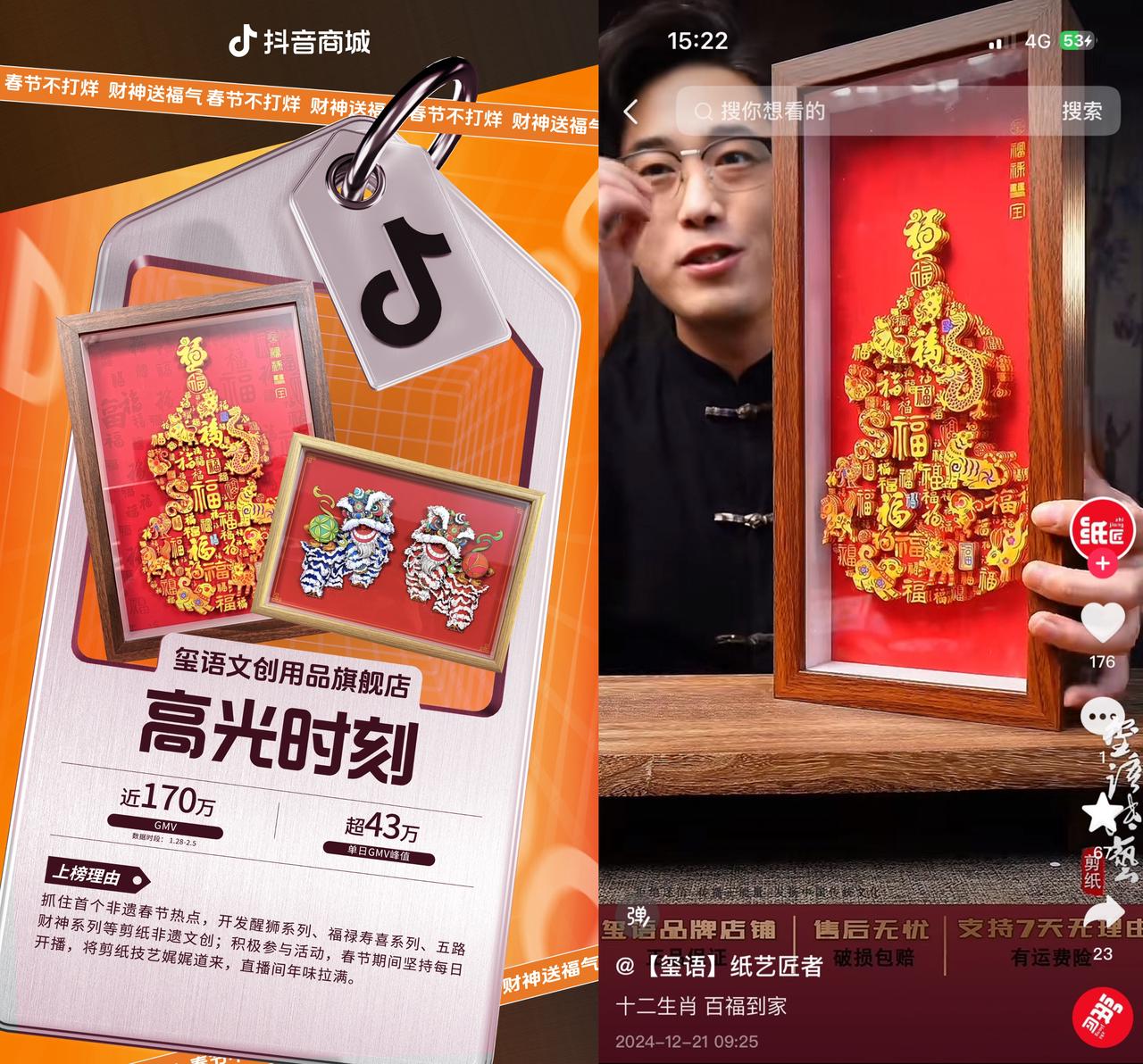中國人把追尋“年味”刻進(jìn)DNA,體驗(yàn)非遺文化成為最具年味的存在。2025年春節(jié)是首個(gè)“非遺版”中國春節(jié),主打國潮文創(chuàng)、非遺文創(chuàng)的店鋪獲得廣大消費(fèi)者追捧。曾獲得省級(jí)文創(chuàng)大賽金獎(jiǎng)的非遺頭部商家璽語文創(chuàng)用品旗艦店,堅(jiān)持春節(jié)每天開播,生動(dòng)有趣地介紹非遺剪紙技藝,堪稱“年味擔(dān)當(dāng)”。其針對(duì)春節(jié)開發(fā)的醒獅系列、福祿壽喜系列、五路財(cái)神系列等多款高端剪紙藝術(shù)非遺文創(chuàng)深受用戶喜愛,銷量一路猛增。1月28日-2月5日春節(jié)大促期間店鋪營業(yè)額近170萬元,單日峰值超43萬元。