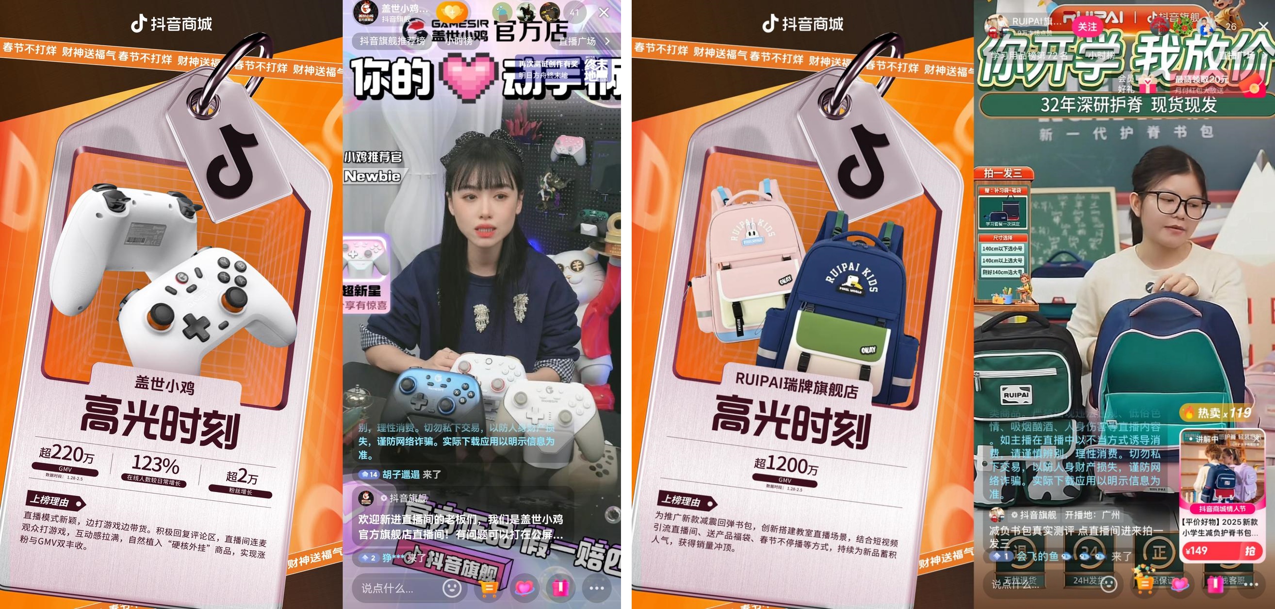 個(gè)性化的沉浸式直播場(chǎng)景也能夠助力商家流量爆發(fā)。春節(jié)是一個(gè)難得放松身心的長(zhǎng)假,蓋世小雞店鋪直播間創(chuàng)造性地邊打游戲邊帶貨,帶網(wǎng)友一起嗨玩整個(gè)春節(jié),互動(dòng)感拉滿。春節(jié)期間,店鋪漲粉超2萬,1月28日至2月5日熱賣超220萬元,同比增長(zhǎng)81%。RUIPAI瑞牌旗艦店為推廣新款減震回彈書包,搭建教室直播場(chǎng)景,并結(jié)合短視頻引流直播間、送產(chǎn)品福袋、春節(jié)不停播等方式,持續(xù)為新品蓄積人氣,獲得銷量沖頂。春節(jié)期間,該店鋪熱賣超1200萬元,成為全新人氣王。