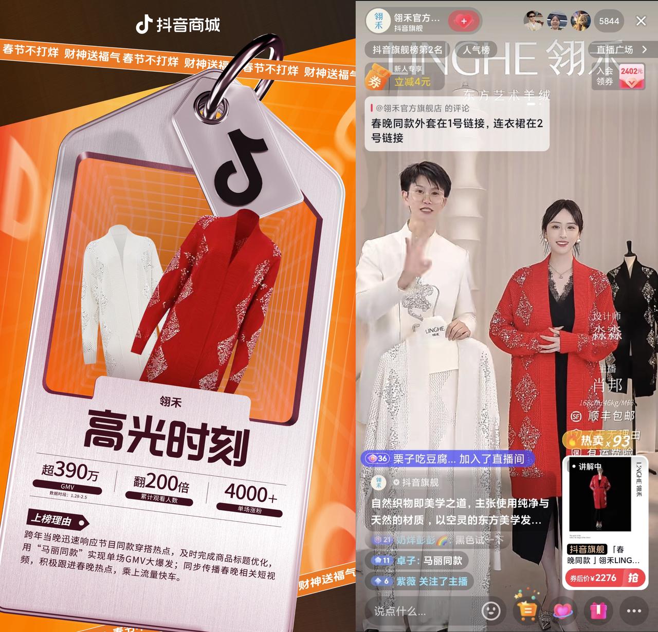 羊絨女裝店鋪翎禾同樣吃到春晚同款的甜頭。從商品SEO優(yōu)化“馬麗同款”,到發(fā)布相關(guān)熱點(diǎn)短視頻,再到上線熱點(diǎn)#必須讓我媽擁有馬麗同款開衫,產(chǎn)品與春晚流量熱潮無縫銜接。直播間網(wǎng)友直呼“太快了”“剛看完馬麗,就搜到了”。銷量和曝光度也隨之穩(wěn)穩(wěn)到手,店鋪GMV翻12倍,春晚同款單品貢獻(xiàn)占比78%、單場(chǎng)漲粉 4000+、累計(jì)觀看人數(shù)翻200倍達(dá)60萬。