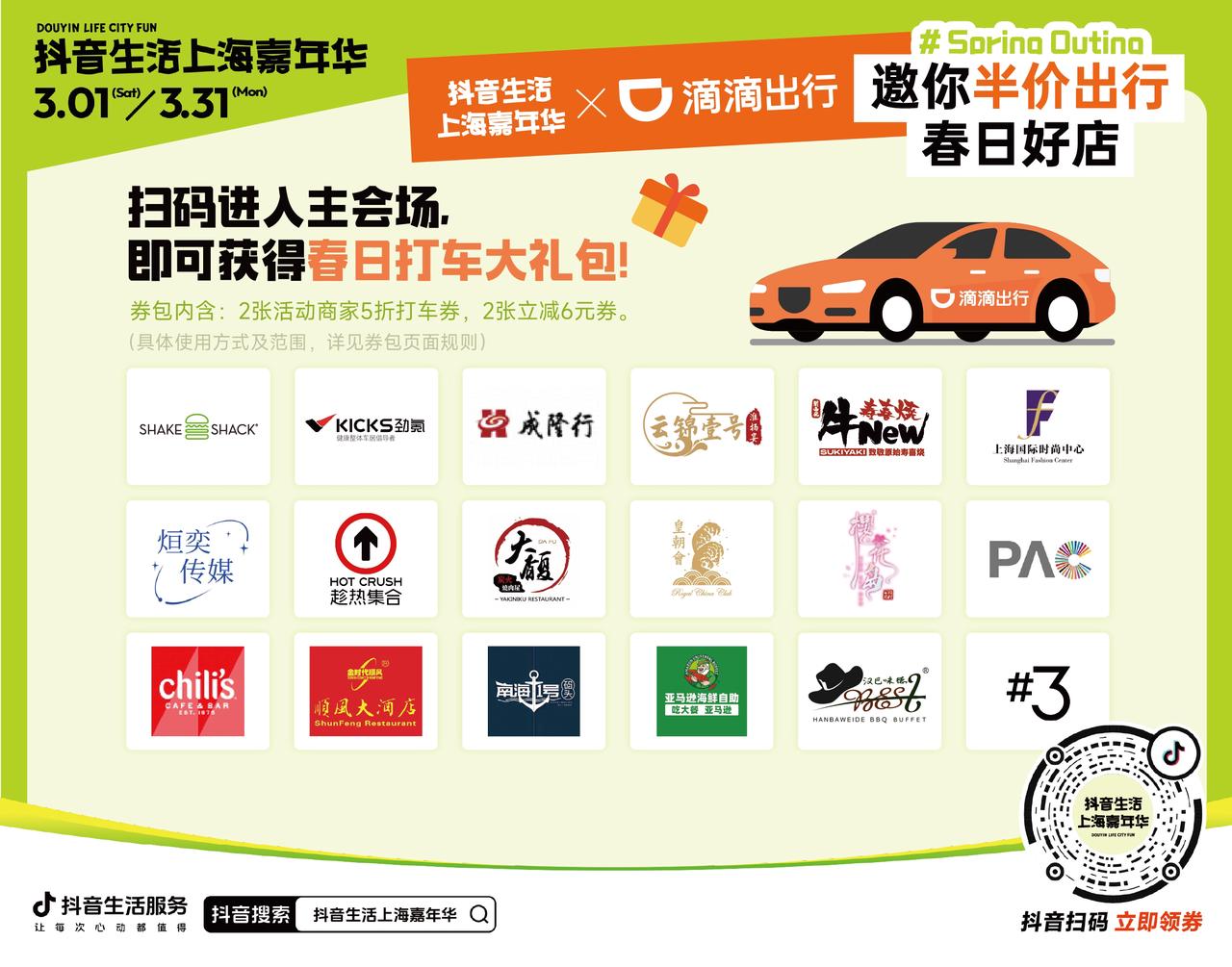 “HOT CRUSH、KICKS勁氪汽車腳墊工廠、淵樹傳媒、Shake Shack、順風(fēng)大酒店、大馥·炭火燒肉屋、顧村公園-櫻花島、上海國際時尚中心、奇利斯、云錦壹號淮揚(yáng)宴、成隆行、皇朝會……”在活動主會場,抖音生活服務(wù)聯(lián)合超五千家商家提供超過17萬件上海特色優(yōu)惠團(tuán)購商品,涵蓋特色餐飲、踏青出游、汽車保養(yǎng)等多個品類。消費(fèi)者還可通過分享活動領(lǐng)取10元優(yōu)惠券。同時,平臺還與12個本地生活商家合作,推出上海城市打卡地圖,為網(wǎng)友推薦上海吃喝玩樂寶藏地。