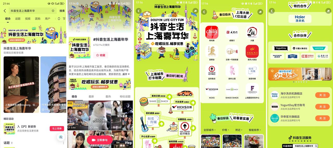 申城春臨景色佳,此時出行樂無涯。“抖音生活上海嘉年華”精選上海城市特色,聯(lián)合上海本地商家提供優(yōu)惠團(tuán)購商品、政企聯(lián)動共同推出商圈城市直播間集合線上線下互動玩法,為消費(fèi)者提供豐富的上海吃喝玩樂消費(fèi)體驗。數(shù)據(jù)顯示,2025年2月25日至3月31日,上海抖音團(tuán)購消費(fèi)同比增長69%。