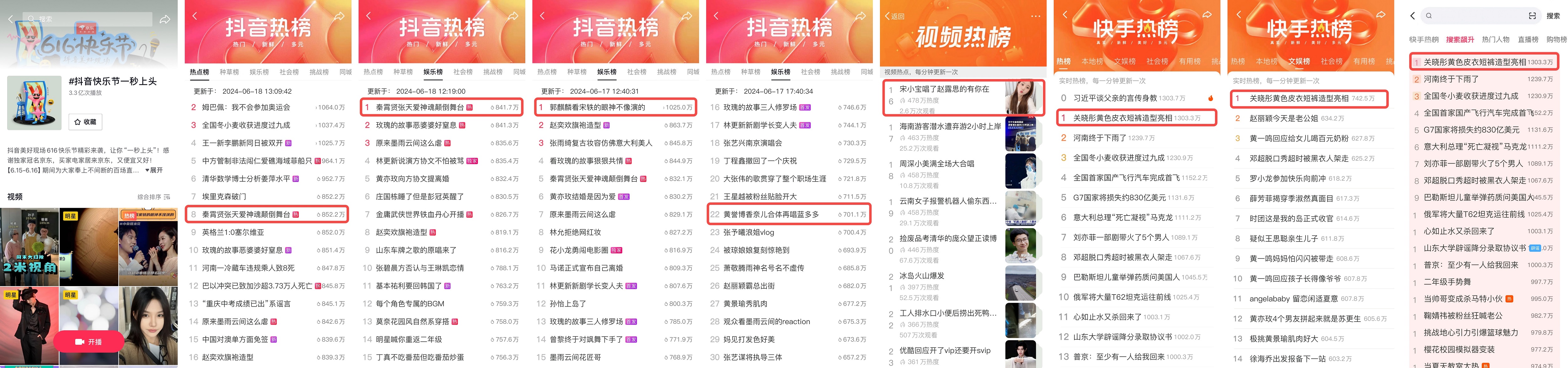 抖音美好現(xiàn)場616快樂節(jié)直播觀看人數(shù)2765萬+,截至目前,#抖音快樂節(jié)一秒上頭 話題曝光3.3億+,直播間總互動量突破269萬+,相關(guān)內(nèi)容獲全網(wǎng)64個熱點,#秦霄賢張?zhí)鞇凵窕觐嵉刮枧_、#郭麒麟看宋軼的眼神不像演的、#黃譽博香奈兒合體再唱藍(lán)多多、#宋小寶唱了趙露思的有你在#、#關(guān)曉彤黃色皮衣短褲造型亮相 登各平臺熱榜,引發(fā)網(wǎng)友熱烈討論。