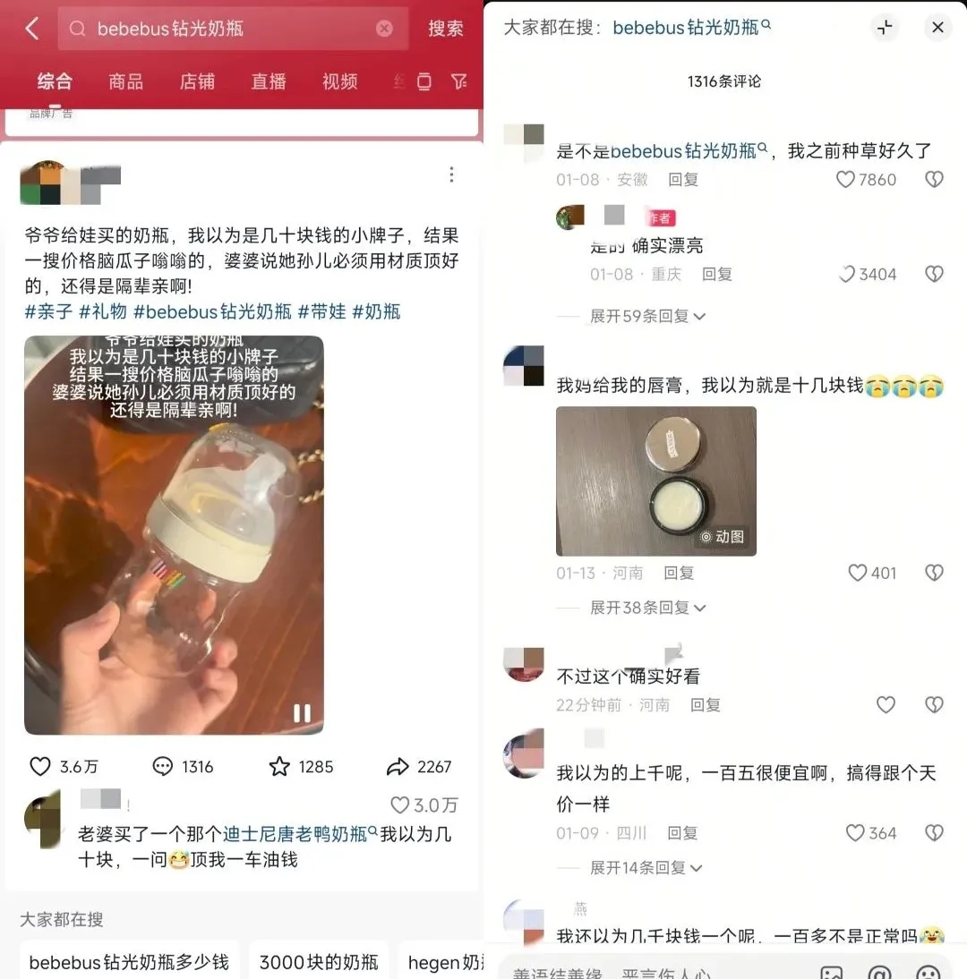 在抖音搜索“隔輩親”這個話題,我們會發(fā)現(xiàn)大量視頻都吸引了用戶的點贊評論。其中就有一條“爺爺買回來的奶瓶,還以為是幾十塊錢的小牌子,結(jié)果一搜價格腦瓜子嗡嗡的”,這種反差感極強(qiáng)的話題引發(fā)了網(wǎng)友激烈的討論,也讓相關(guān)內(nèi)容爆火,為品牌提供了充足的討論、搜索熱度。