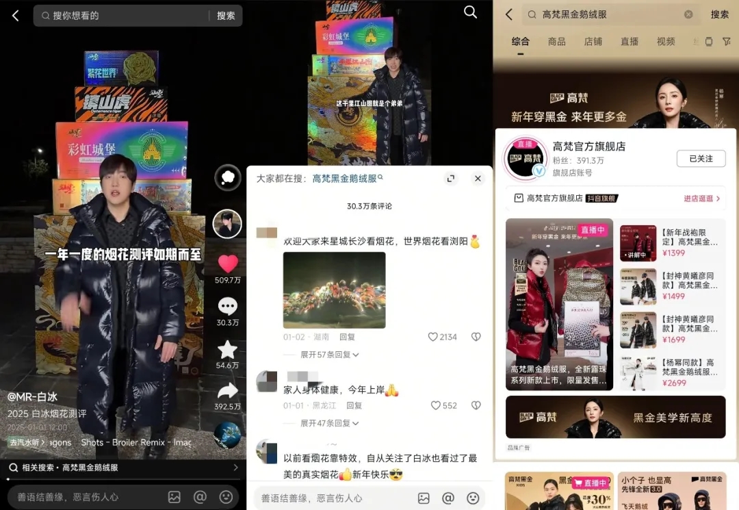 知名羽絨服品牌高梵就在2025年開年之際與超頭部達(dá)人@MR-白冰 展開合作,并借助煙花測評和新年祈福的議題打造,用高質(zhì)量的短視頻吸引了大量用戶點贊、圍觀。目前該條視頻的點贊量超過500萬,同時還引發(fā)了30多萬條評論、近55萬個收藏,轉(zhuǎn)發(fā)分享即將突破400萬次。
