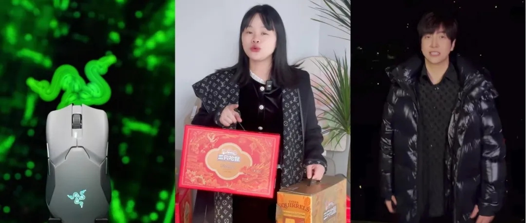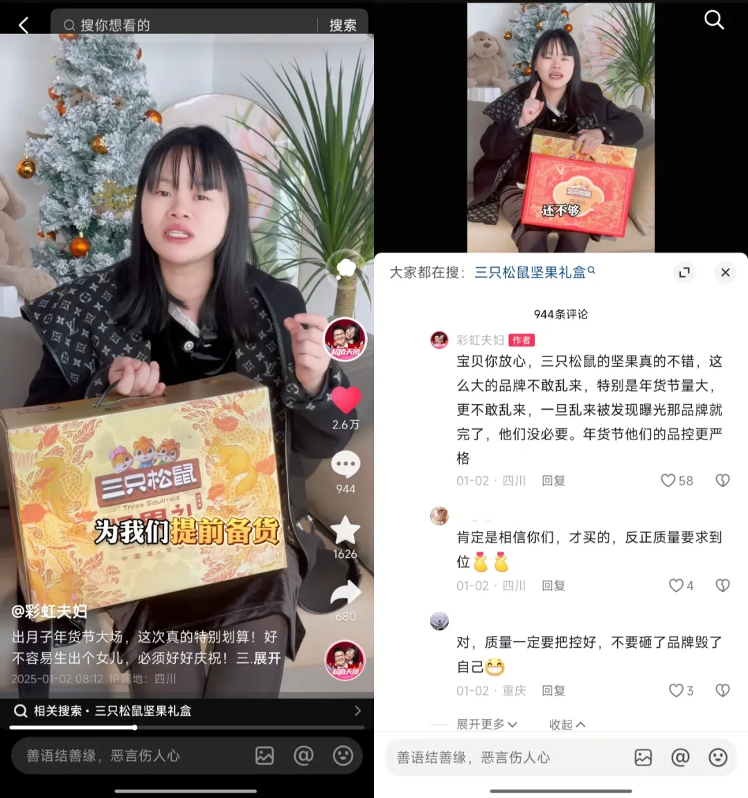 與高梵選擇頭部達(dá)人聯(lián)動不同,三只松鼠在年貨節(jié)期間則與@彩虹夫婦 @特別烏啦啦 @丁佳偉 等27位達(dá)人展開矩陣式合作。因為堅果禮盒的客單價更低,需要觸達(dá)的用戶群體比羽絨服更龐大,聯(lián)動大量達(dá)人有助于三只松鼠觸達(dá)更大范圍、更多元的群體。