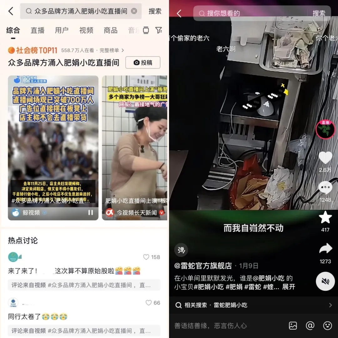 2024年年底,“因愛重生”的肥娟小吃店無意間登上熱搜,瞬間成為熱議的焦點。心細(xì)的網(wǎng)友發(fā)現(xiàn),肥娟小吃店的角落里竟然有一只雷蛇鼠標(biāo)。雷蛇當(dāng)然不會錯過這個熱度,官方直接下場在@肥娟小吃 直播間狂刷禮物,并在評論區(qū)互動提升熱度,吸引大量網(wǎng)友圍觀、討論。