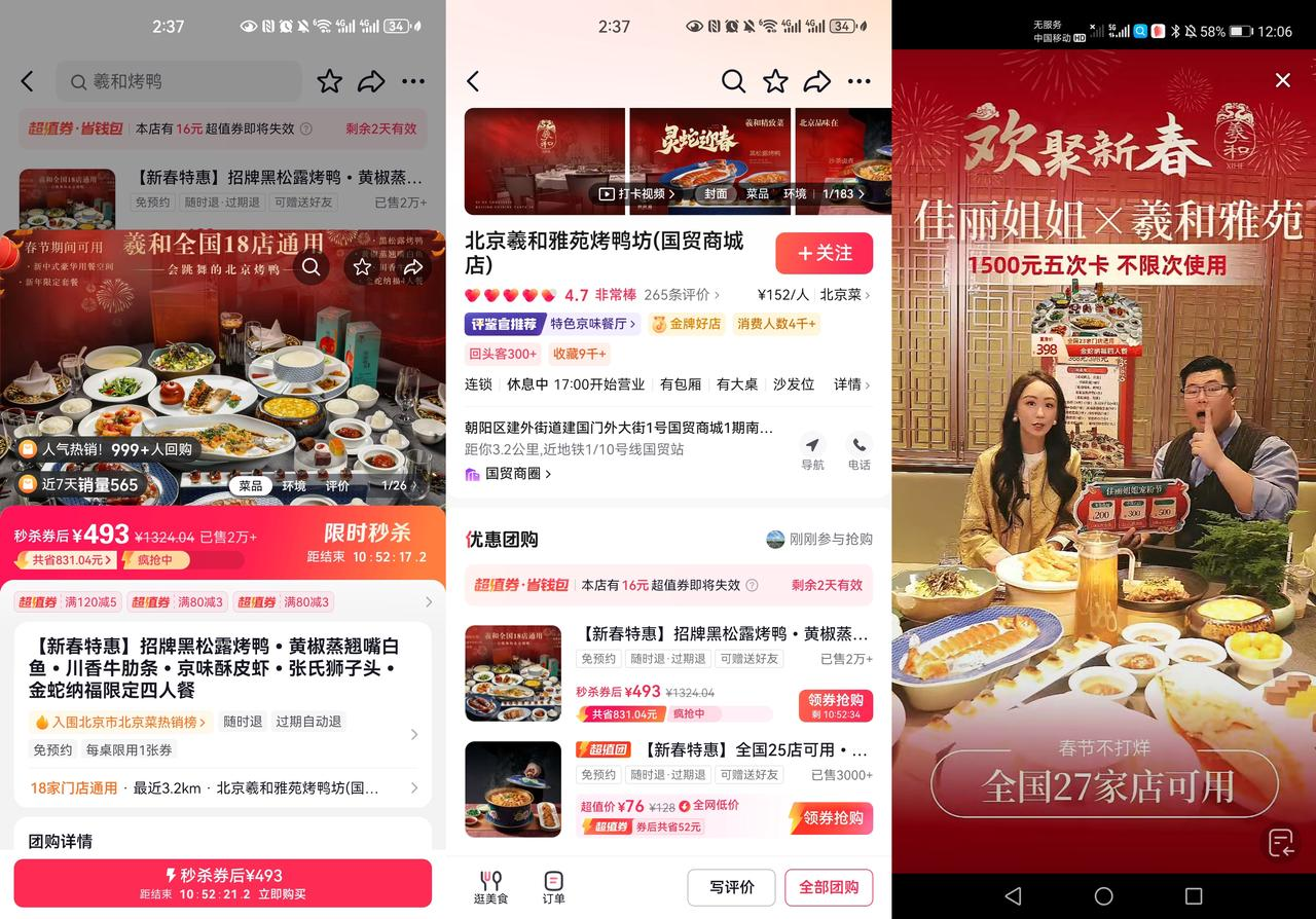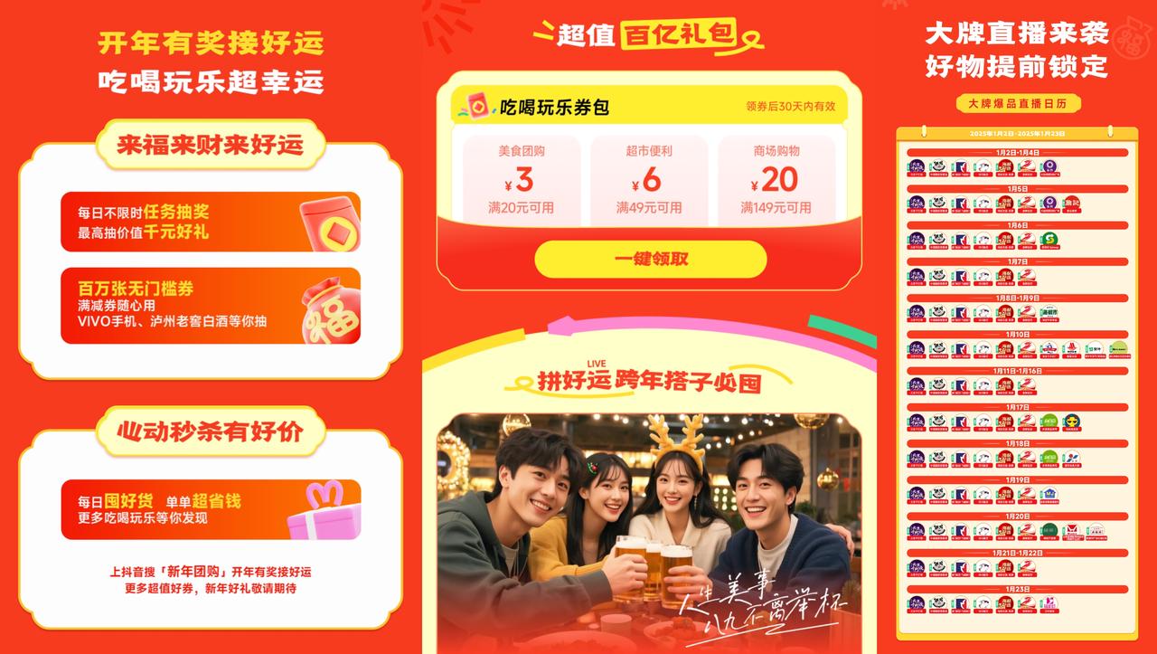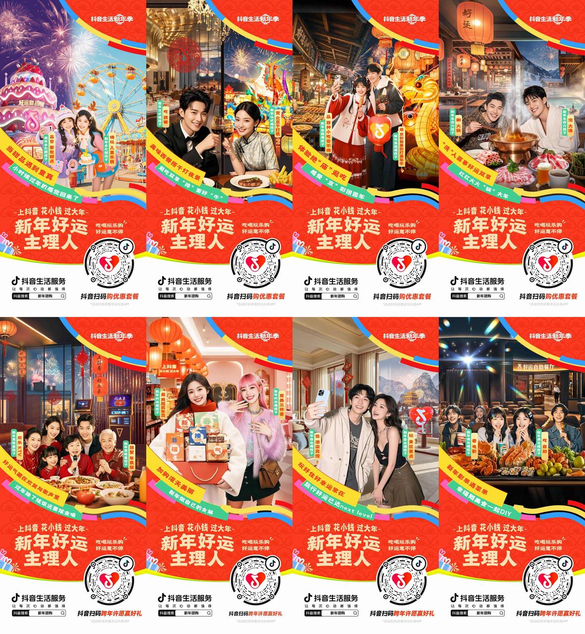 如今,過(guò)年期間的娛樂(lè)已不再局限于單一的吃團(tuán)圓飯、看春晚的傳統(tǒng)模式,而是演變成了集購(gòu)物、娛樂(lè)、休閑于一體的多重消費(fèi)體驗(yàn)。人們開(kāi)始追求更加多元化、個(gè)性化的慶祝方式,讓新春充滿無(wú)限可能。以“甜品+樂(lè)園”開(kāi)啟多巴胺之旅、以“北京千燈夜+西餐”碰撞出中西合璧的儀式感、以“KTV+年夜飯”讓團(tuán)聚的歡笑更加倍...... 活動(dòng)期間,抖音生活服務(wù)圍繞祈福、許愿、吉祥、好運(yùn)等新年情緒,將不同品類的商家巧妙融合,推出8組「新年好運(yùn)搭子」海報(bào),營(yíng)造春節(jié)爆款氛圍感,加持消費(fèi)體驗(yàn)的同時(shí),助力商家支付大幅增長(zhǎng)。