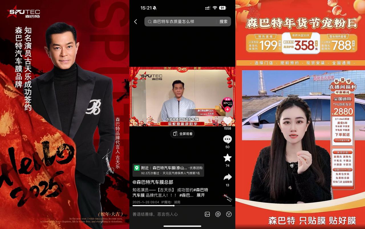 森巴特汽車膜搭建了由200多個(gè)達(dá)人和門店商家組成的內(nèi)容矩陣,從明星專場(chǎng)直播、區(qū)域頭部達(dá)人直播大場(chǎng)、到品牌各區(qū)域門店常態(tài)化直播、品牌官號(hào)自播、達(dá)人探店多方面創(chuàng)意聯(lián)動(dòng)產(chǎn)出內(nèi)容,有效提升品牌在春節(jié)期間的熱度和知名度。其中,直播間圍繞「森巴特年貨節(jié)寵粉日」主題展開(kāi),交易額達(dá)490萬(wàn)+,成交轉(zhuǎn)化率上升40%。為進(jìn)一步提升品牌影響力,森巴特汽車膜簽約著名影星古天樂(lè)作為品牌形象代言人,不僅增強(qiáng)了品牌的公信力,也吸引了大量“新年好運(yùn)主理人”的關(guān)注,助力品牌搜索PV突破800萬(wàn)+。在明星代言和常態(tài)運(yùn)營(yíng)的組合營(yíng)銷下,新春季每日直播累計(jì)25場(chǎng),GMV達(dá)10萬(wàn)+。通過(guò)加大本地推投流,全國(guó)節(jié)日短視頻投稿鋪排,品牌春節(jié)累計(jì)投稿數(shù)達(dá)1.6萬(wàn)條。此外,加大春節(jié)期間商品供給力度、推出改色膜核心產(chǎn)品等加碼福利,更是使其春節(jié)期間乘勢(shì)而上,訂單不斷。