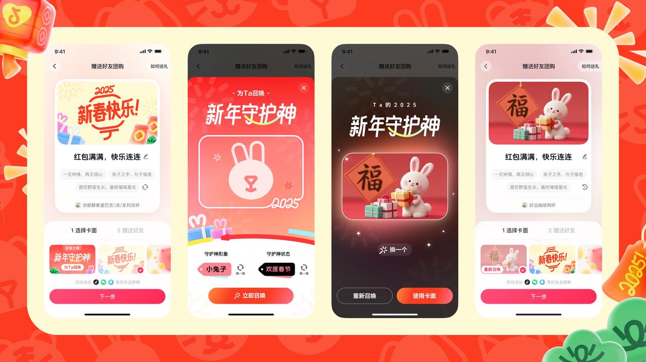 今年 1 月 24 日至 2 月 12 日期間,抖音生活服務(wù)特別打造了“召喚守護(hù)神”、趣味禮物特效等一系列特色產(chǎn)品活動(dòng)。用戶在送禮頁面時(shí),能夠通過選擇 “守護(hù)神形象” 與 “守護(hù)神狀態(tài)”,召喚出可愛十足的 “守護(hù)神” 作為獨(dú)特的送禮封面,為對(duì)方定制專屬的新春卡面。當(dāng)然除了“守護(hù)神“,用戶也可以從多種封面如“好柿發(fā)生”“吃好喝好”中自行挑選,也能盡情發(fā)揮創(chuàng)意,自己編輯祝福語,打造屬于彼此的好禮獨(dú)家記憶。