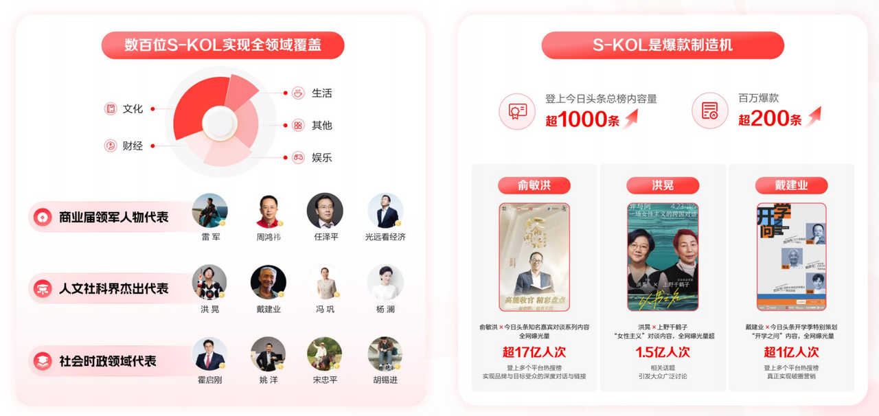 圖源:《2024今日頭條平臺(tái)營(yíng)銷通案》 其次,今日頭條作者與內(nèi)容負(fù)責(zé)人李黎也表示,截至目前有近10萬各行各業(yè)專家和萬余家新聞媒體機(jī)構(gòu),持續(xù)活躍在頭條。平臺(tái)上如俞敏洪、洪晃等不少社會(huì)名人和權(quán)威媒體,也共同構(gòu)建著這個(gè)具有公信力的輿論場(chǎng)。這樣的環(huán)境對(duì)品牌而言是寶貴的借勢(shì)機(jī)會(huì),只需融入其中,品牌便能獲得顯著的影響力提升與公信力加強(qiáng),從而實(shí)現(xiàn)品牌形象的全面升級(jí)。