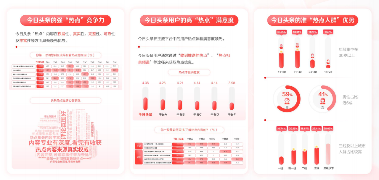 這種持續(xù)不斷的熱點(diǎn)輸出,逐漸在用戶心中形成了穩(wěn)固的認(rèn)知與期待:“想要快速了解熱點(diǎn),就來今日頭條”。在今日頭條龐大的月活躍用戶群體中,有高達(dá)1.2億的用戶對(duì)熱點(diǎn)保持著極高的關(guān)注度,他們平均每天都會(huì)兩次打開頭條熱榜,關(guān)注這些引人入勝的熱點(diǎn)內(nèi)容。長(zhǎng)久以來,今日頭條在熱點(diǎn)內(nèi)容的權(quán)威性、時(shí)效性和視角多樣性方面,都已給用戶留下了深刻的印象。