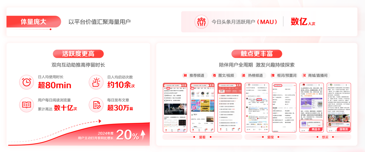 內(nèi)容營(yíng)銷展現(xiàn)出新特點(diǎn),我們也在眾多資訊及內(nèi)容平臺(tái)中發(fā)現(xiàn)了新亮點(diǎn):今日頭條正憑借其獨(dú)特站位,成為品牌與用戶都無法忽視的重要場(chǎng)域。或許很多人對(duì)于今日頭條的印象仍停留在信息流聚合的初始階段,但實(shí)際上這個(gè)平臺(tái)已經(jīng)大不一樣。 營(yíng)銷角度看,用戶在哪,品牌就應(yīng)該在哪。目前今日頭條擁有數(shù)億級(jí)的月活用戶,日人均使用時(shí)長(zhǎng)超過80分鐘,日人均啟動(dòng)次數(shù)達(dá)十余次,用戶每日的閱讀瀏覽量也累計(jì)達(dá)到了數(shù)十億次,2024年度用戶主動(dòng)打開率也同比增長(zhǎng)超20%。這種品牌認(rèn)知、用戶規(guī)模和活躍度,無疑先是為品牌商家搭好了一個(gè)值得前來的舞臺(tái)。