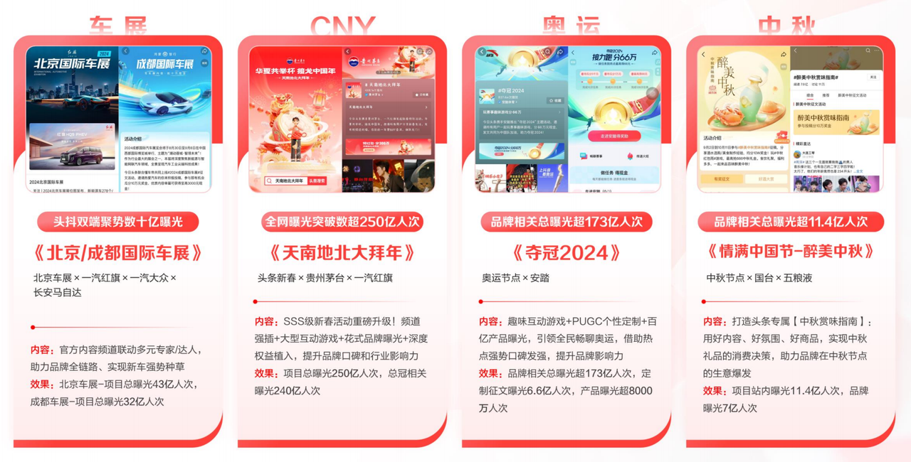 圖源:《2024今日頭條平臺(tái)營(yíng)銷通案》 今日頭條就曾攜手中國(guó)網(wǎng)財(cái)經(jīng)發(fā)起《世界車·中國(guó)造》欄目,攜手超過40家權(quán)威媒體共同聚焦國(guó)產(chǎn)汽車品牌的發(fā)展故事。欄目在全網(wǎng)的總曝光量超120億人次,登上各平臺(tái)熱搜榜9次,深深觸動(dòng)了廣大用戶對(duì)中國(guó)企業(yè)崛起與奮斗的共鳴。并且品牌還策劃了專屬話題活動(dòng),成功將在公域內(nèi)產(chǎn)生共鳴的用戶引導(dǎo)至品牌陣地,拉新人群規(guī)模超1.6億,品牌A3種草人群提升了超223%,5A人群中拉新比例過半。