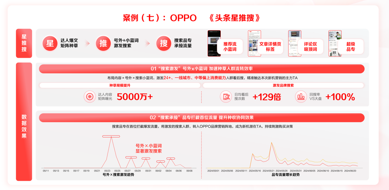 OPPO就是個(gè)典型案例,此前品牌在運(yùn)用“星推搜”這個(gè)營(yíng)銷策略,搜索就發(fā)揮了重要作用。品牌先與達(dá)人合作輸出內(nèi)容(即“星”),而后展開內(nèi)容推廣(即“推”),并在內(nèi)容中設(shè)置搜索小藍(lán)詞(必現(xiàn))、評(píng)論區(qū)吸頂詞等等,成功吸引用戶在閱讀后直接點(diǎn)擊搜索,品牌的日均看后搜次數(shù)也因此增長(zhǎng)129倍,品牌曝光度顯著提升。同時(shí),OPPO還設(shè)置了搜索品專,有效攔截并承接了搜索流量,將被激發(fā)的搜索人群高效引入品牌自有陣地,從而帶動(dòng)轉(zhuǎn)化和留存。