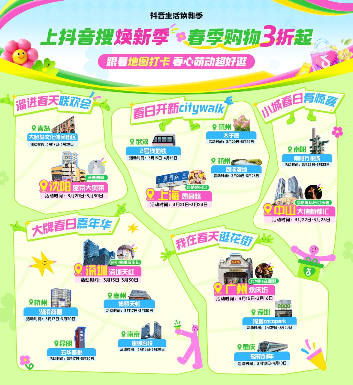 即日起至4月15日,跟著這張「春心萌動打卡地圖」到指定商場打卡活動,跟抖音生活解鎖線下商圈購物新體驗。先買后逛,為你的春日煥新儀式感再加碼!