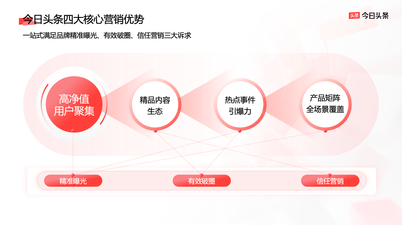 針對(duì)品牌對(duì)更高質(zhì)量營(yíng)銷的需求,今日頭條基于高凈值用戶聚集、精品內(nèi)容生態(tài)、熱點(diǎn)事件引爆力、產(chǎn)品矩陣全場(chǎng)景覆蓋四大核心優(yōu)勢(shì),給出了可靠、高效的解決方案,助力品牌實(shí)現(xiàn)精準(zhǔn)曝光、有效破圈和信任營(yíng)銷,在復(fù)雜環(huán)境中收獲增長(zhǎng)。