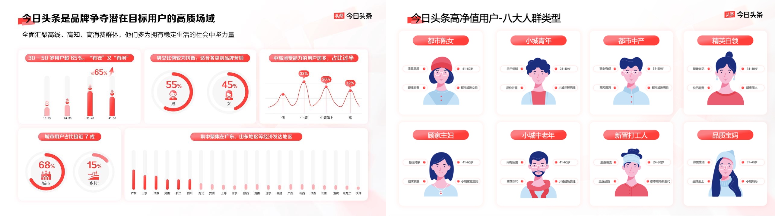 今日頭條月活躍用戶高達(dá)數(shù)億,其中30 - 50歲用戶超65%,中高消費(fèi)能力占比近半,城市用戶占比接近 7 成,匯集高線、高知、高消費(fèi)群體,是擁有穩(wěn)定生活的社會(huì)中堅(jiān)力量,正是品牌爭(zhēng)奪潛在目標(biāo)用戶的高質(zhì)場(chǎng)域。