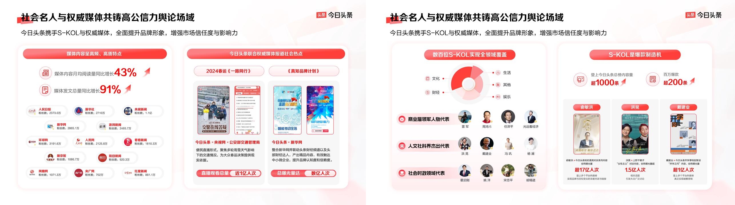 在內(nèi)容創(chuàng)作門(mén)檻降低、信息源多元化的今天,用戶更傾向于信任來(lái)自專業(yè)機(jī)構(gòu)、權(quán)威媒體或行業(yè)領(lǐng)袖的信息。今日頭條構(gòu)建的社會(huì)名人和權(quán)威媒體生態(tài),幫助品牌建立“信任坐標(biāo)”。今日頭條聚焦豐富的社會(huì)名人/明星及權(quán)威媒體,例如人民日?qǐng)?bào)、新華社、央視新聞、環(huán)球網(wǎng)、新華網(wǎng)、澎湃新聞等,并開(kāi)創(chuàng)了一系列優(yōu)質(zhì)節(jié)目,大幅提升用戶信任度,讓品牌的發(fā)聲更加擲地有聲。