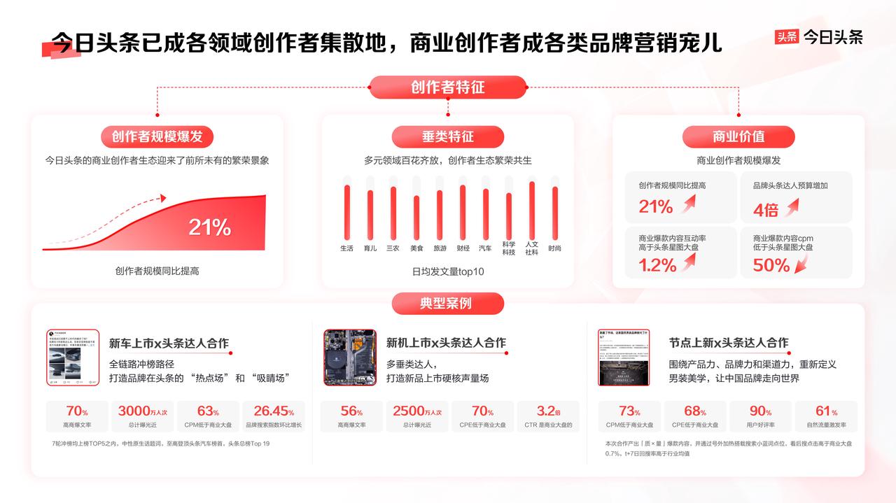 有了高曝光下一步則是促進(jìn)高效轉(zhuǎn)化。今日頭條經(jīng)過(guò)多年發(fā)展,已成為各領(lǐng)域創(chuàng)作者集散地,能夠高效聚合用戶注意力,幫助品牌實(shí)現(xiàn)破圈觸達(dá)。其中,百余種不同類型的優(yōu)質(zhì)創(chuàng)作者結(jié)合了專業(yè)科普與生活經(jīng)驗(yàn)類優(yōu)質(zhì)內(nèi)容,為品牌產(chǎn)品提供了深度種草的土壤。