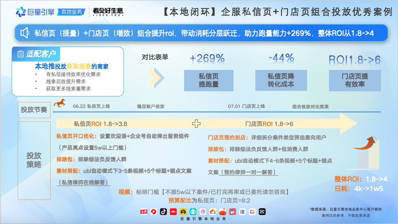 “私信頁(提量)+門店頁(增效)”這一組合同樣適合本地推投放獲取線索的商家,包括有私信接待效率優(yōu)化需求、線索后效提升需求、獲取更多線索量需求的商家,能夠帶動(dòng)消耗分層躍遷,助力跑量能力和ROI雙提升。