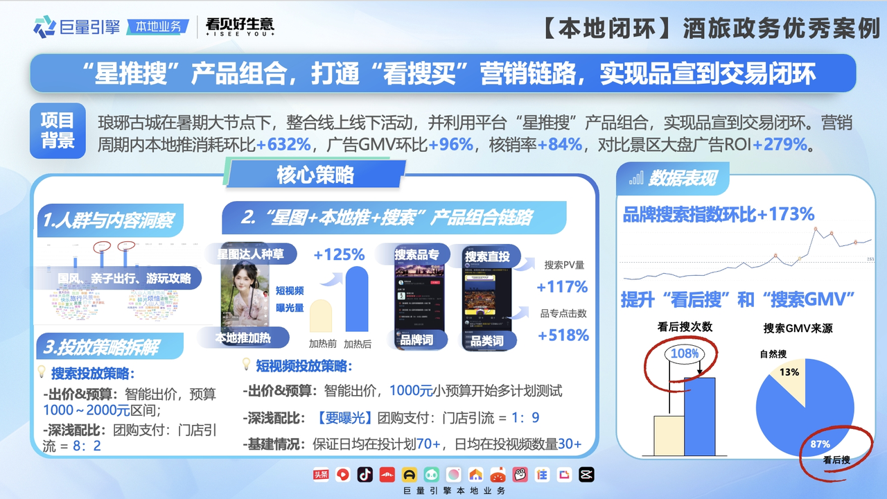 恰逢暑期這一文旅行業(yè)一年中熱度最高的營(yíng)銷節(jié)點(diǎn)之一,瑯琊古城積極整合線上線下活動(dòng),并利用巨量平臺(tái)“星推搜”產(chǎn)品組合,實(shí)現(xiàn)品宣到交易閉環(huán)。