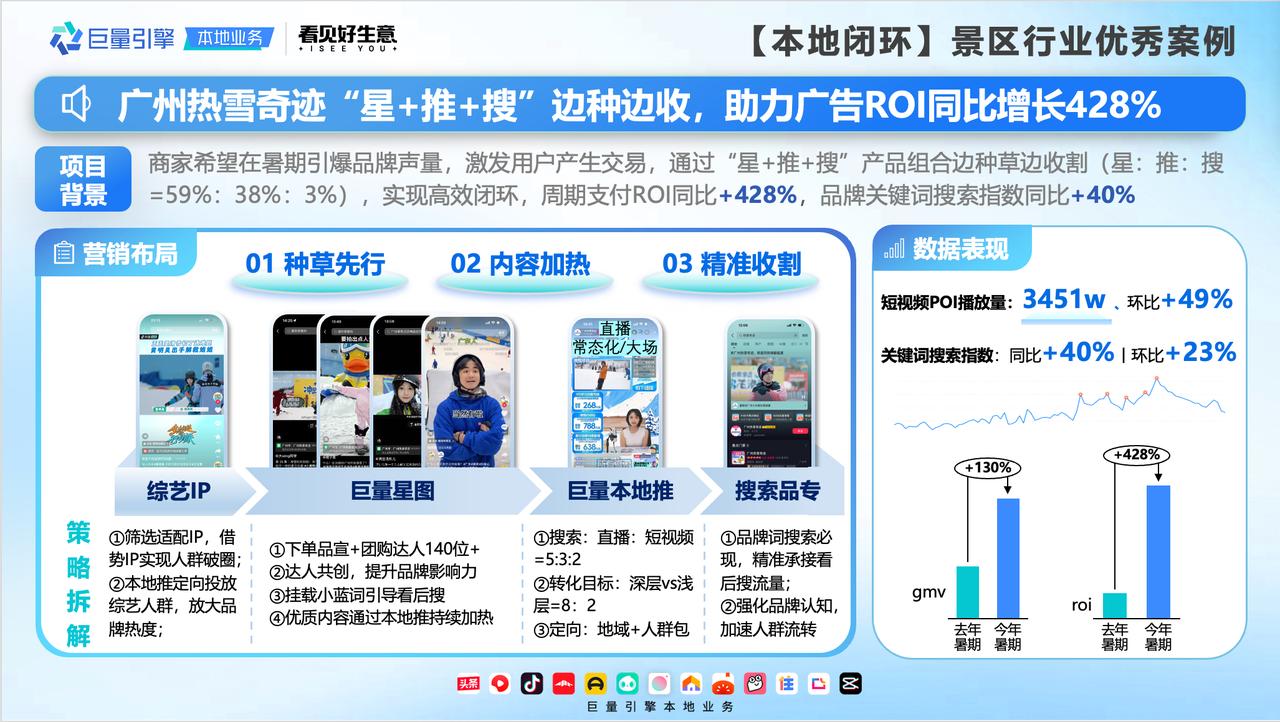 文旅行業(yè)在營(yíng)銷時(shí)容易出現(xiàn)“叫好不叫座”的尷尬局面,多少精心制作的攻略和美食美景視頻在網(wǎng)友的收藏夾里吃灰?多少爆款內(nèi)容轉(zhuǎn)化卻寥寥無幾?打破文旅營(yíng)銷難局面,瑯琊古城和廣州熱雪奇跡在巨量平臺(tái)利用“星圖+本地推+搜索”產(chǎn)品組合,在抖音站內(nèi)實(shí)現(xiàn)了“種收一體”,既提升了品牌宣傳效果,又有效提高了ROI。