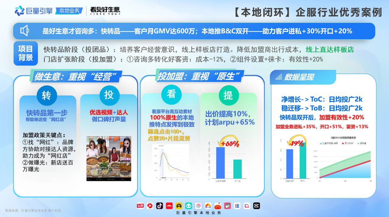 數(shù)據(jù)呈現(xiàn)驗(yàn)證了策略與模式的正確性,快轉(zhuǎn)品雙開后,加盟有效性提升超20%,加盟業(yè)務(wù)私信上漲超35%,留資增長(zhǎng)13%。