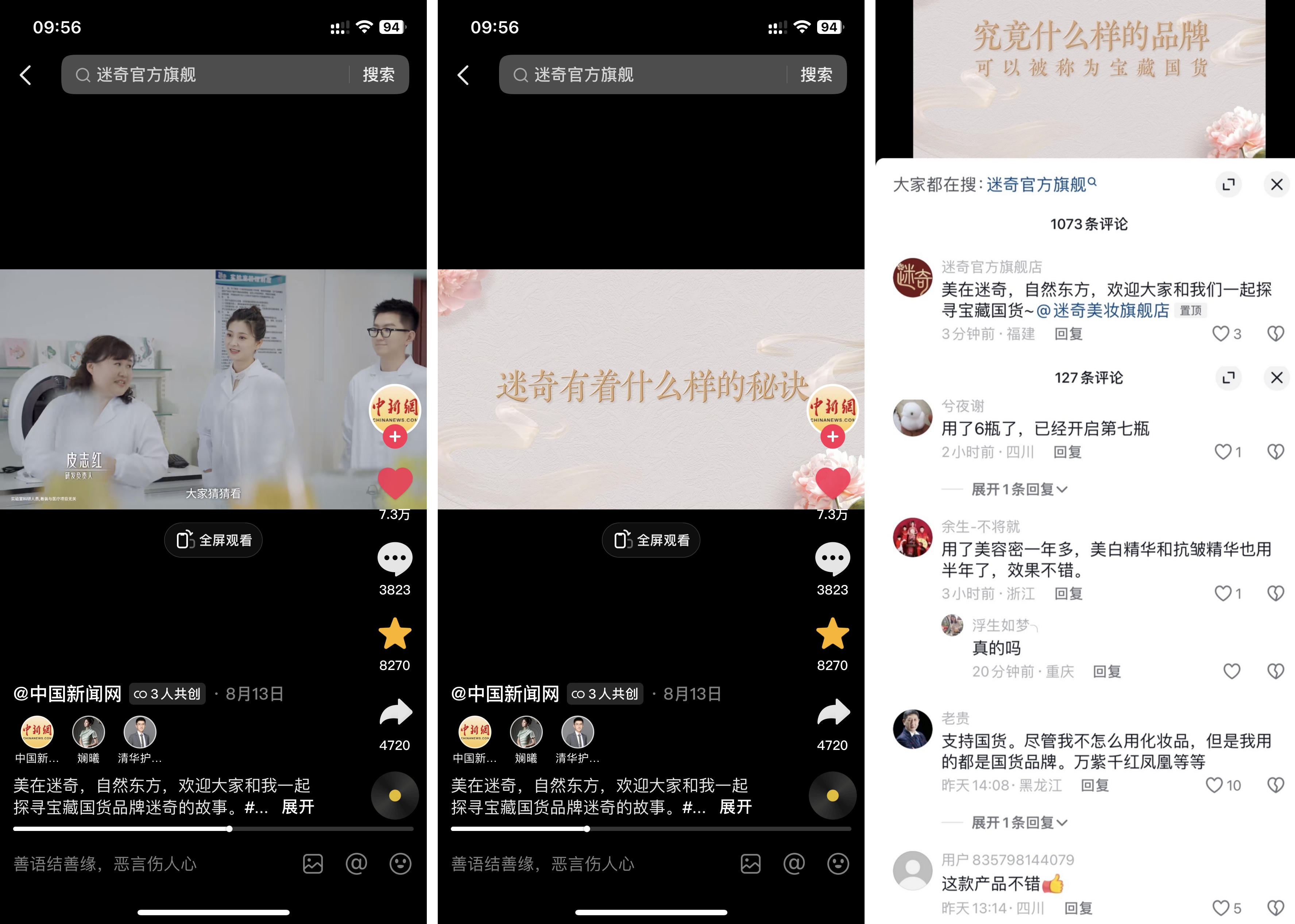 一方面,不同于過(guò)去直白的新品發(fā)布論,國(guó)牌美妝如今更青睞挖掘自身的優(yōu)勢(shì),比如更深厚的文化底蘊(yùn)、對(duì)本土消費(fèi)者需求的精準(zhǔn)把握等。以37年老國(guó)貨美容產(chǎn)品品牌迷奇為例,擅長(zhǎng)將牡丹花卉、人參等自然植物提取物融入美妝產(chǎn)品之中,挖掘護(hù)膚潛力。在抖音,迷奇選擇發(fā)掘消費(fèi)者的細(xì)分需求,探索更加細(xì)分的賽道,既有主攻祛斑美白的迷奇美白肌底液,又有主攻抗皺淡紋的迷奇高級(jí)神奇美容蜜。