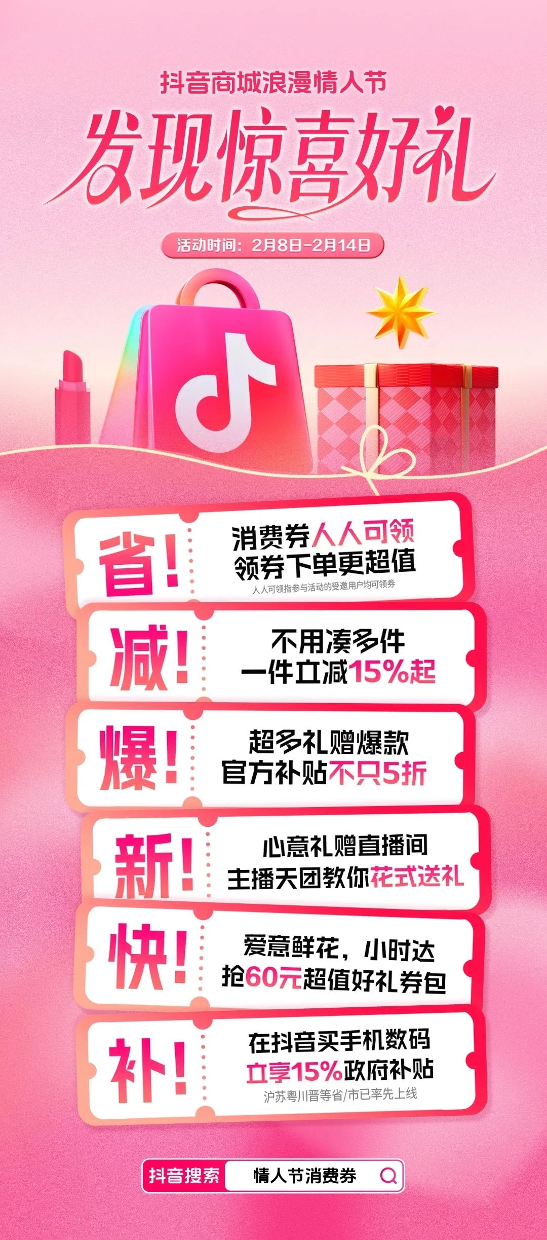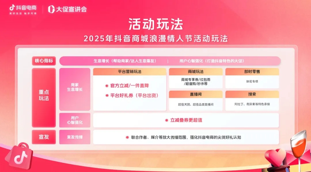 為助力更多商家捕捉這一節(jié)點機(jī)遇,高效承接用戶明確消費(fèi)需求,平臺特推出2025年抖音商城浪漫情人節(jié)活動。2月8日至14日,抖音電商投入海量的流量激勵和用戶補(bǔ)貼,鼓勵商家達(dá)人敞開售賣現(xiàn)貨,贏得春節(jié)后業(yè)績的快速恢復(fù)和爆發(fā)增長。