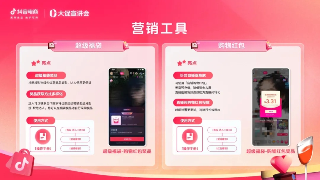 超級福袋是提升用戶的購買意愿和轉(zhuǎn)化率的玩法之一。本次活動,超級福袋將新增購物紅包優(yōu)惠獎品類型,達(dá)人使用更便捷。此外,針對自播型商家,平臺推出的購物紅包,具備可直接抵扣貨款,投放時間設(shè)置更靈活等優(yōu)點,高效助力直播間轉(zhuǎn)化。