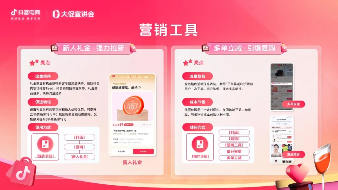 通過設(shè)置新人禮金,商家能夠有效吸引新用戶首次下單,顯著提升新用戶的轉(zhuǎn)化率。參與活動的商品還將享受專屬流量扶持,涵蓋內(nèi)容場的推薦Feed流、抖音商城的“猜你喜歡”等,增加曝光機(jī)會;希望促進(jìn)復(fù)購的商家則可以參與多單立減,不僅能夠激勵用戶增加購買頻次,提升用戶粘性,而且通過合并訂單的方式,商家能節(jié)省物流成本,創(chuàng)造出更多讓利空間,實現(xiàn)用戶與商家的雙贏。