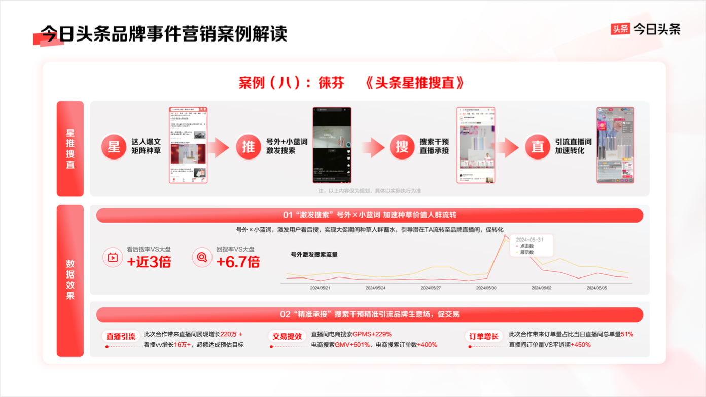 個(gè)護(hù)小家電品牌徠芬,在今日頭條巧用「頭條星推搜直」,打通達(dá)人爆文矩陣種草、號(hào)外+小藍(lán)詞激發(fā)搜索、搜索干預(yù)直播承接、引流直播間加速轉(zhuǎn)化全鏈路,在產(chǎn)品從種草到交易全過(guò)程中,構(gòu)建出品牌專屬注意力真空?qǐng)鲇颉?br />在大促期間,各平臺(tái)流量既繁雜又昂貴。而徠芬在今日頭條的商業(yè)化產(chǎn)品矩陣布局,以更效果導(dǎo)向,精準(zhǔn)構(gòu)建品牌生意場(chǎng),從而實(shí)現(xiàn)直播間電商搜索GPMS增長(zhǎng)229%,電商搜索GMV增加501%、電商搜索訂單數(shù)增長(zhǎng)400%。在大促期間,實(shí)現(xiàn)品牌高效種草轉(zhuǎn)化。